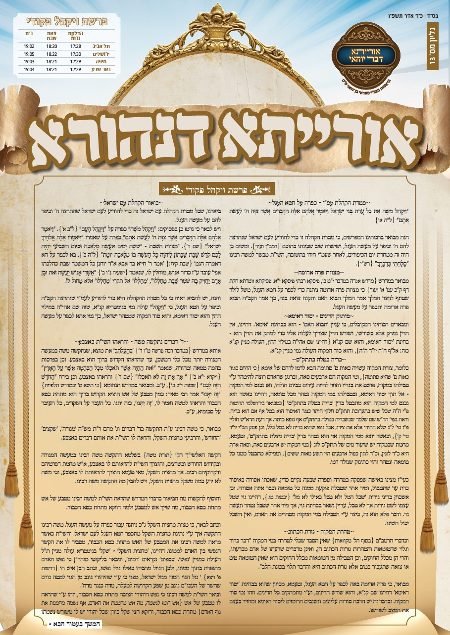 גיליון 'אורייתא דנהורא' לפרשת ויקהל-פקודי תשפ"ו