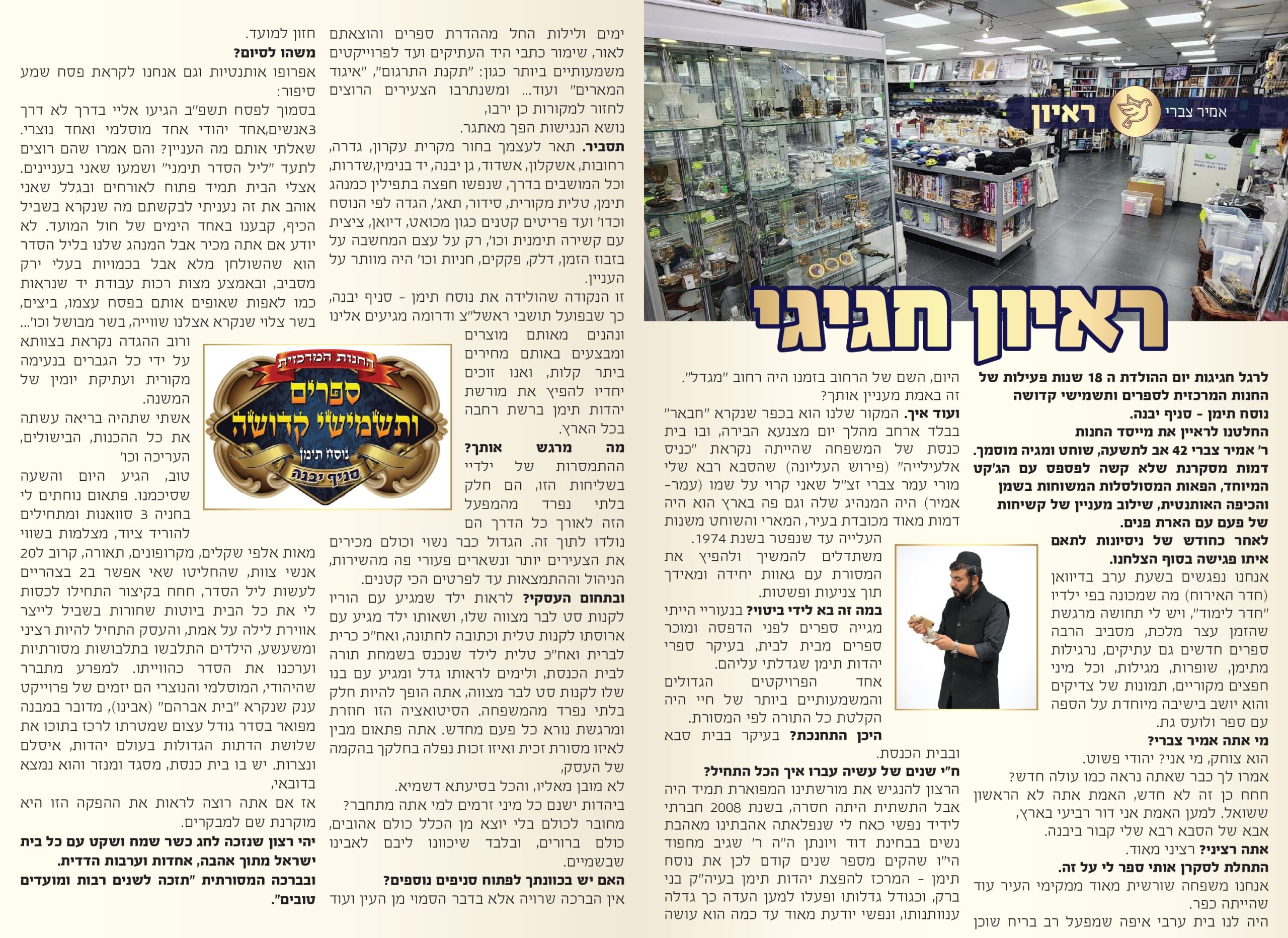דף הבית » עידכונים » ריאיון חגיגי: אמיר צברי מסכם 18 שנות פעילות של החנות המרכזית 'נוסח תימן' – סניף יבנה >>>