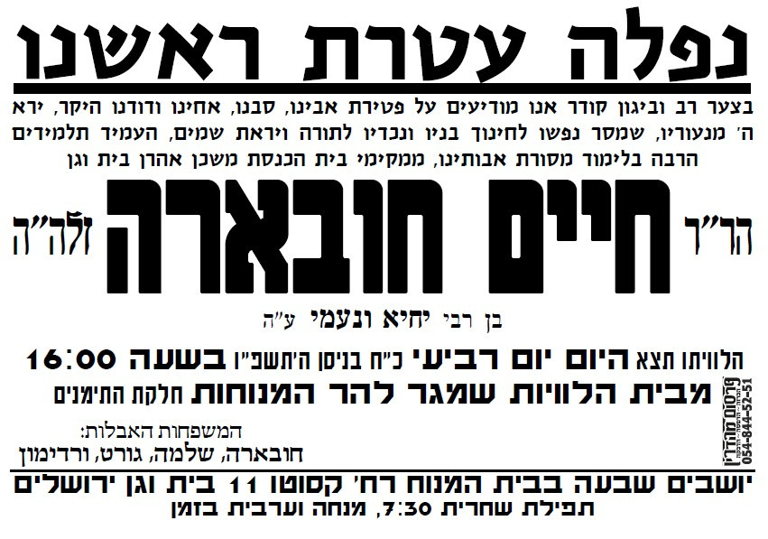 רבים ליוו אתמול למנוחת עולמים את מארי חיים חובארה זצ"ל – מפארי שכונת בית וגן ומהמקימים בתוכה את ק"ק תימן 'משכן אהרן' המפוארה שבראשות יבלחטו"א הגה"צ רבי ציון חוברה שליט"א.